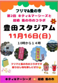 第2回 キティ&マーシーズと超絶蚤の市とコラボ 豊田スタジアムフリーマーケット 120店 名鉄豊田線「豊田市駅」より、徒歩約15分 愛知環状鉄道「新豊田駅」より、徒歩約17分 2つの駅は隣接しており、その間は2分程度。駅からは駅前通を真っ直ぐ進み、豊田大橋を渡ればスタジアムです。