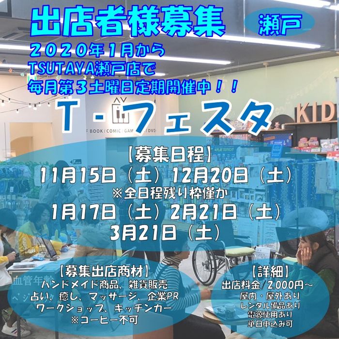 20 18年12月から開催スタート。20 25年10月時点で78回の開催実績があるイベントです。TSUTAYA瀬戸店様はバロー様、ニトリ様と併設する複合型商業区画の一角になります。近隣の方が日常の買い物で来られる場所になります。