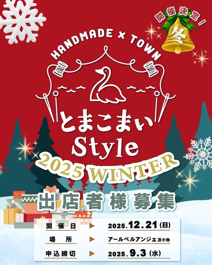 『「人」と「まち」をつなぐ』をコンセプトに、苫小牧市で行われているハンドメイドイベントです。12月21日(日)は、住吉町にある結婚式場「アールベルアンジェ」にて開催されます。ハンドメイド雑貨をはじめ、フード、手作り体験、企業ブースなど、全道各地から多彩なジャンルが集まります。クリスマスの自分へのご褒美や、大切な人への贈り物選びにもぴったりの催しです。