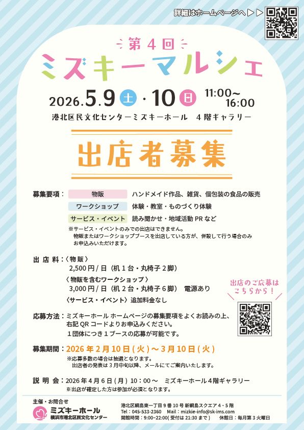 横浜市港北区の文化芸術の活動・発信拠点「ミズキーホール」で、5月9日(土)・10日(日)に開催されるマルシェです。多彩なハンドメイド作品や雑貨、食品、野菜や果物の販売をはじめ、各種ワークショップ、読み聞かせ、地域活動のPRなども行われます。屋内開催のため天候を気にせず楽しめ、大人から子どもまで幅広い世代が気軽に参加できるイベントです。