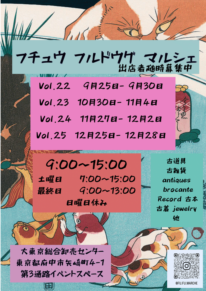 大東京綜合卸売センター内の広い催事場で行われる古道具、アンティーク、骨董、古着、古本、レコードの約15店舗が集まる小さな古い物マルシェです。