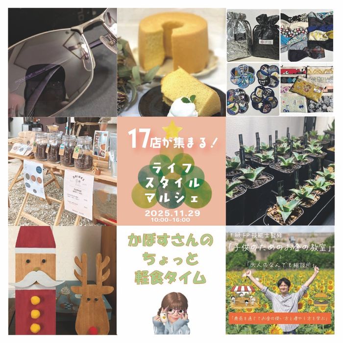 「住まい」「食」「雑貨」「体験」「エンタメ」の5つのエリアが融合!アクセサリー、コーヒー、たい焼きなどのマルシェから、FP相談や家づくり相談まで、約15以上のバラエティ豊かなブースが集結します。