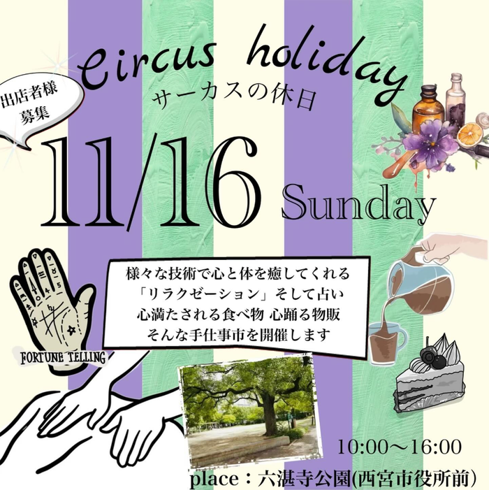西宮神社で毎月開催されている人気の「てづくりサーカス」が、新たな試みとして開催するイベント。11月16日(日)、六湛寺公園にて開催されます。心と体を癒すリラクゼーションをはじめ、美容や健康にまつわる手仕事や、心の矢印をそっと示してくれる占いなど、“癒し”をテーマにしたブースがずらりと並びます。もちろん、心と体に元気をくれる物販や飲食ブースも充実。癒しと楽しさがやさしく混じり合う、そんな特別な一日を、ぜひご体感ください。