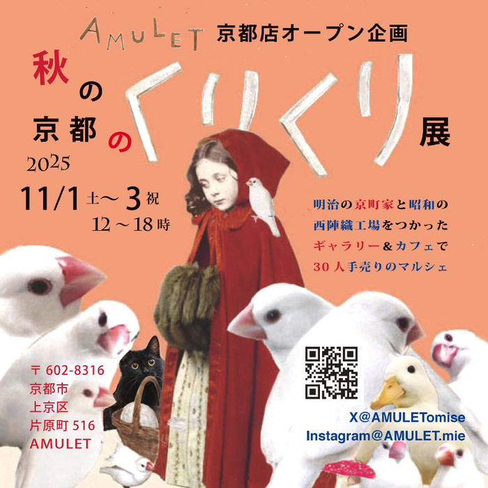 11月1日(土)から3日(祝)まで、歴史ある京町家と西陣織の工場を改装したギャラリー&ブックカフェ「AMULET京都店」のオープン企画として開催されるマルシェイベントです。30人の作家が集まり、ぬいぐるみやアクセサリー、雑貨など、個性豊かでかわいらしいハンドメイドの品々を販売します。作家との会話も楽しみながら、お気に入りの作品を見つけてみてください。