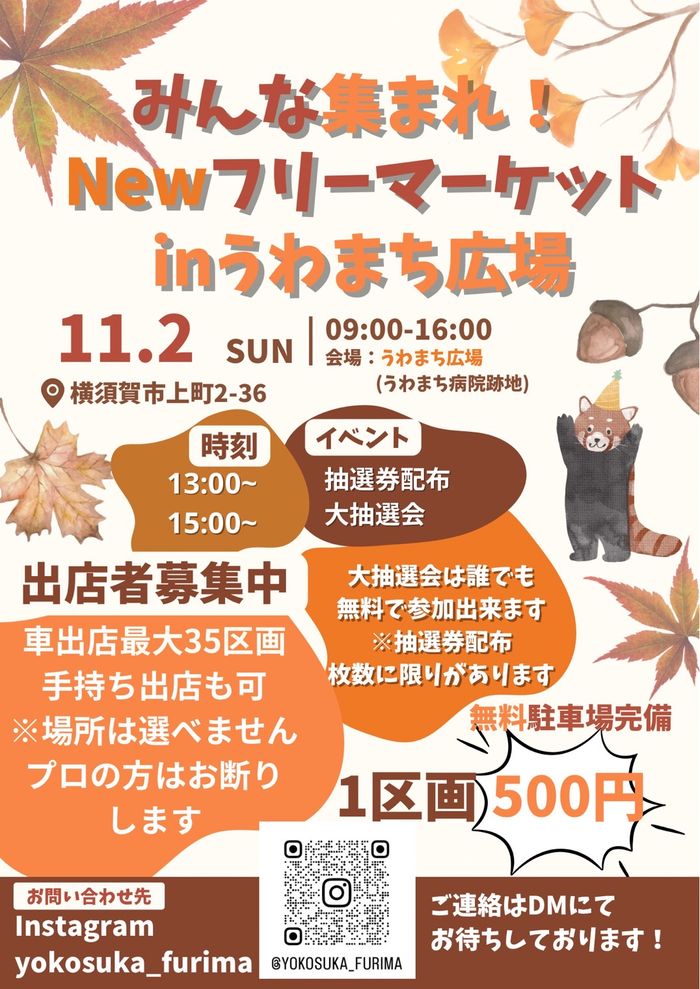 横須賀市うわまち病院跡地うわまち広場でフリーマーケット初開催します。車出店最大35区画出店予定です。来場者様の無料駐車場あります。抽選会のイベントやります。
