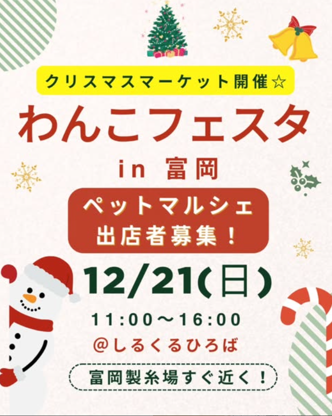 「わんこフェスタin富岡」は、11:00から16:00まで富岡製糸場から徒歩10分の会場で開催されるペットイベントです。ペットマルシェやキッチンカー、獣医師やしつけ相談、ペットマッサージ、フォトブースなど多彩なプログラムが楽しめます。運動会やドッグラン、保護犬猫とのふれあいもあり、愛犬と一緒に充実した時間を過ごせるイベントです。