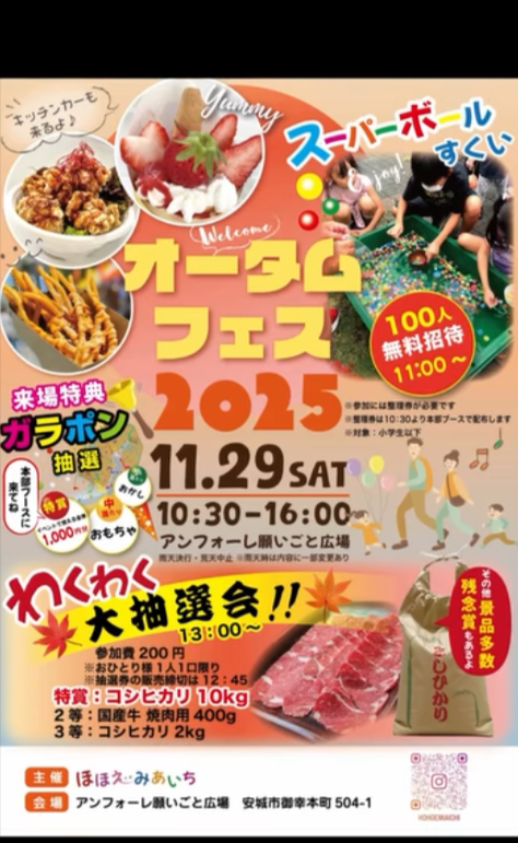 スーパーボールすくい、体験ワークショップ、○×クイズ大会、わくわく大抽選会など、秋空の下で親子で楽しめるイベントがいっぱい!遊んで、学んで、笑顔になれる秋祭り🍁✨