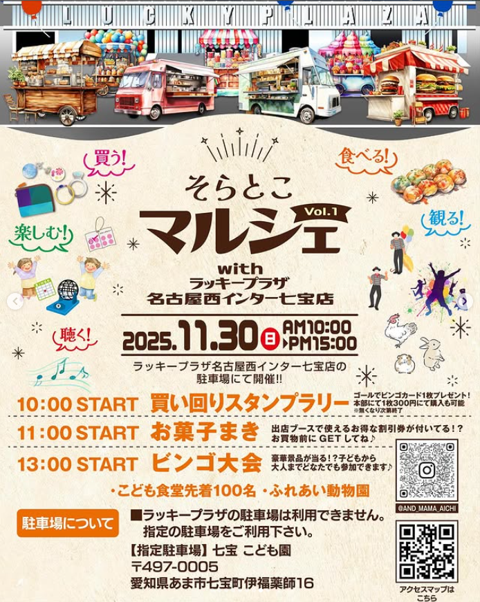 11月30日(日)、ラッキープラザ名古屋西インター七宝店の駐車場で開催されるマルシェです。親子で楽しめる体験ブースをはじめ、グルメ、癒し・診断・ワークショップ、ハンドメイド雑貨や小物販売、こども出店ブースなど、多彩な内容がそろいます。さらに、スタンプラリー&ビンゴ大会やふれあい動物園など、イベントも盛りだくさん。見守りサポート付きのキッズスペースもあり、家族みんなで一日中のびのび楽しめます。