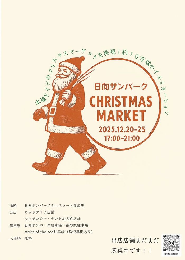 宮崎県の複合公園・日向サンパークで、2025年12月20日〜12月25日にクリスマスマーケットが開催されます。心も体もあたたまるフードやドリンクをはじめ、クリスマスならではの雑貨、個性が光るハンドメイド作品、アウトドア・ガーデニング用品など、60ブース以上の多彩なお店が並びます。占いやヒーリング、体験型ワークショップも楽しめます。美しくきらめくイルミネーションを眺めながら、ゆったりとしたひとときをお過ごしください。