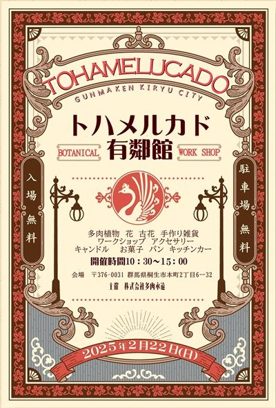 「トハメルカド」は群馬県・栃木県を中心に行われる、植物主体のフェスをコンセプトにしたマルシェです。今回は、桐生市の歴史ある蔵を活用したイベントスペース「有鄰館」で開催されます。植物と調和した作家との出会いや、プロフェッショナルな食を提供するキッチンカーとの交流を通じて、人と人とがつながり、心豊かな時間を過ごせる空間が広がります。