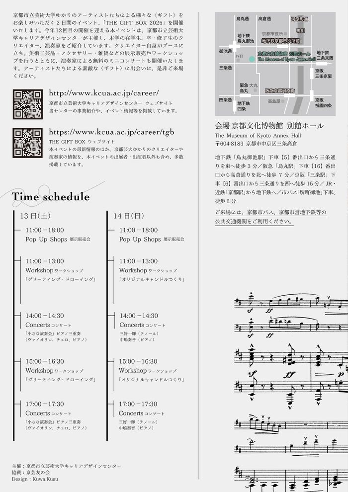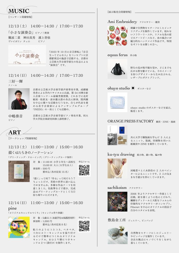 本イベントは、毎年、京都市立芸術大学キャリアデザインセンターが主催し、本学の在学生、卒・修了生のクリエイター、演奏家をご紹介しています。