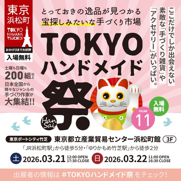 東京・浜松町でアートとクラフトの都市型イベント「TOKYOハンドメイド祭」が開催。ハンドメイド雑貨やアート雑貨、アクセサリーなどハンドメイドクリエイターが全国から集結して展示販売される。あなただけの逸品を見つける宝探しのようなイベント。猫モチーフ雑貨を集めた「浜松町にゃんこ雑貨横丁」も同時開催。