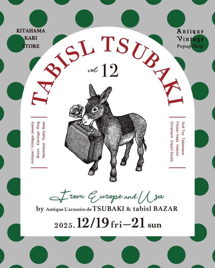 TABISL TSUBAKIは、神戸六甲の小さなアンティークショップAntque Lʼarmoire de TSUBAKI とヴィンテージ雑貨を販売するtabisl BAZAR が、ヨーロッパやアメリカなど世界各国で集めたコスチュームジュエリー、ぬいぐるみ、食器などをお披露目するPOPUP SHOP。