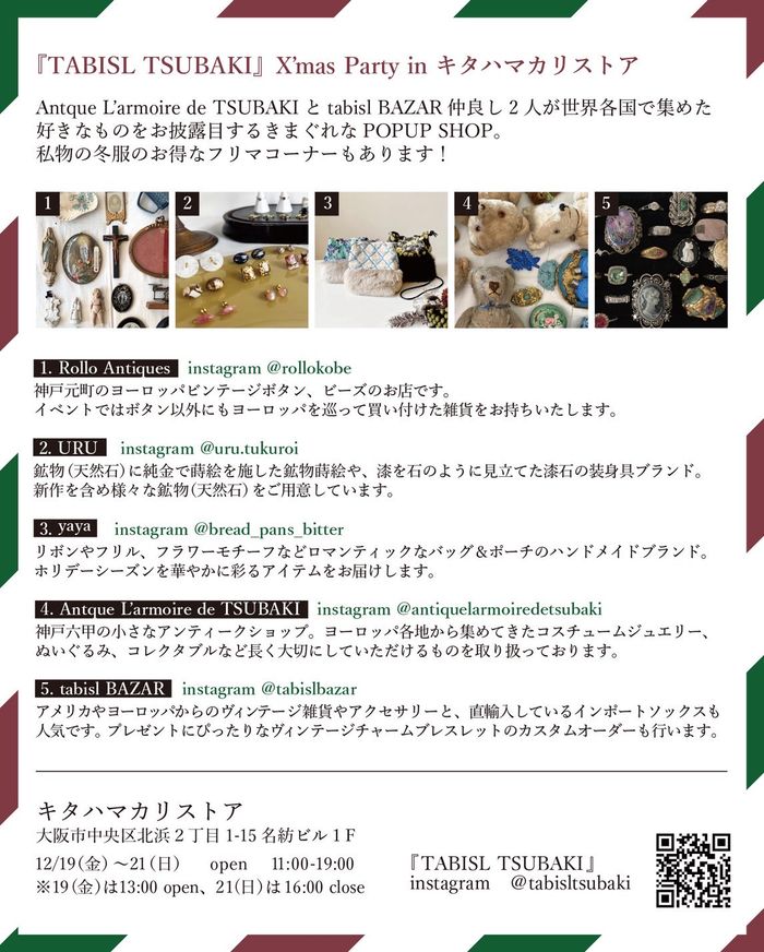 12回目の『TABISL TSUBAKI』を12月19~21日の3日間、大阪・北浜徒歩3分のキタハマカリストアで開催いたします。