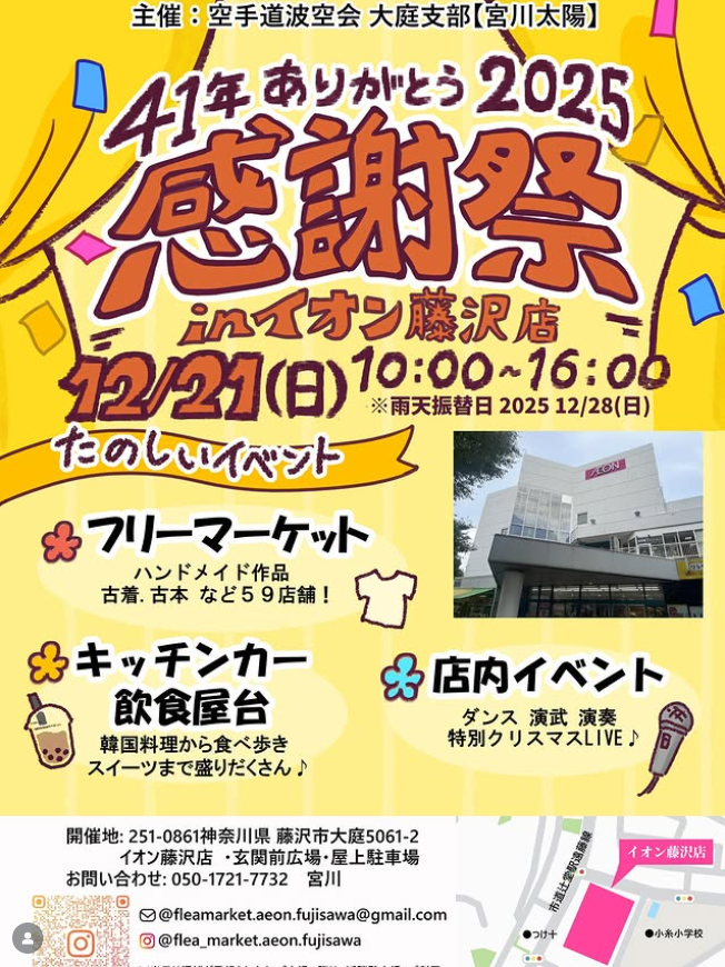 イオン藤沢店の1月末の閉店に伴い、12月21日(日)に開催される感謝祭イベントです。玄関前広場にはキッチンカーや屋台が並び、さまざまなグルメを味わえます。さらに屋上駐車場では、ハンドメイド作品・古着・古本など約50店以上が集まるフリーマーケットを実施。地域の皆さまが楽しめる特別な催しです。