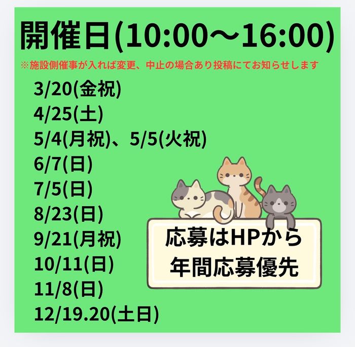 ※会場管理会社の都合により、まれに当日にイベントやキッチンカーが入る場合があります、決まり次第全員にお伝えしますが、その場合はブース場所の変更などにご協力をお願いします。