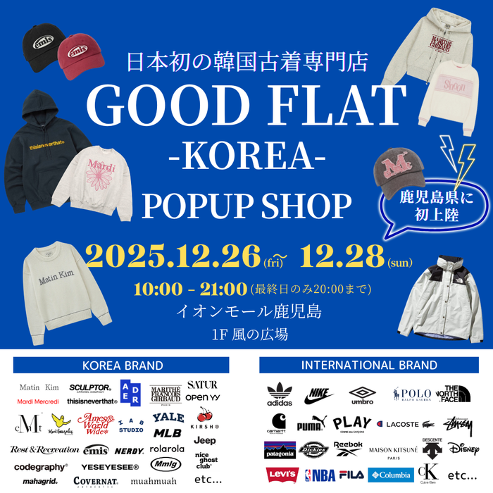 日本の最新ファッショントレンドと掛け合わせた、日本初の韓国古着専門店、『GOODFLAT-KOREA-』 が、鹿児島県に初上陸!イオンモール鹿児島にて3日間限定開催!