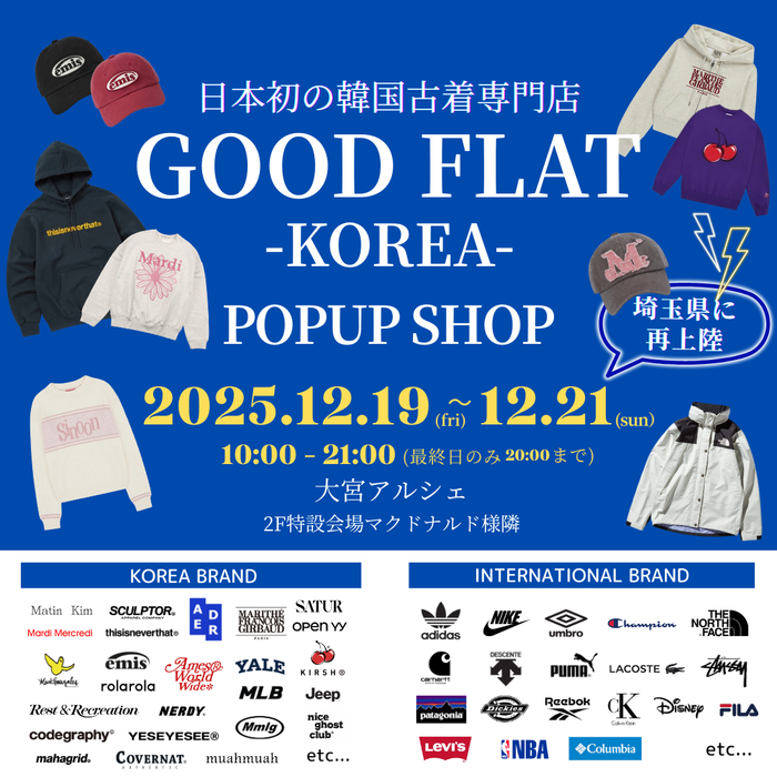 日本の最新ファッショントレンドと掛け合わせた、日本初の韓国古着専門店、『GOODFLAT-KOREA-』 が、埼玉県再上陸!大宮アルシェにて3日間限定開催!