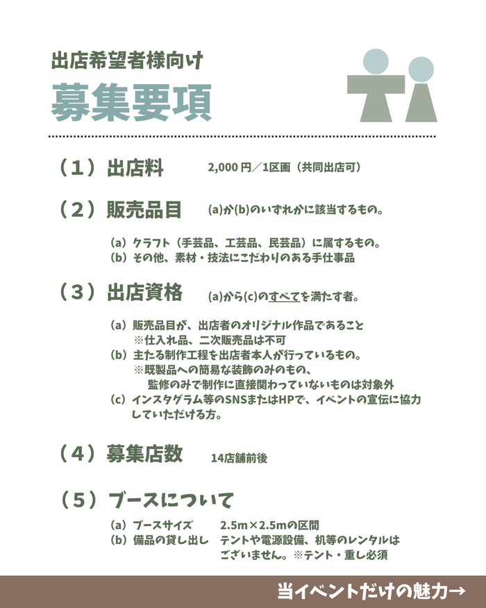 出店者向けの出店料金、出店申込方法、主催者の連絡先まで、出店に必要な情報を掲載しています。