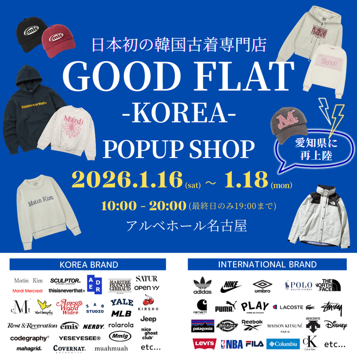 韓国現地でしか手に入らないレアブランドから、日本ではまだ流通の少ない注目ブランドまで日本の最新ファッショントレンドと掛け合わせた、日本初の韓国古着専門店『GOODFLAT-KOREA-』が3日間限定で愛知県に再上陸。1会場あたり5,000点以上の豊富なアイテム数を誇り、期間中はユニセックスアイテムを中心に新作商品を随時追加。性別・世代問わず訪れるたびに新しい出会いが楽しめる空間を提供する。