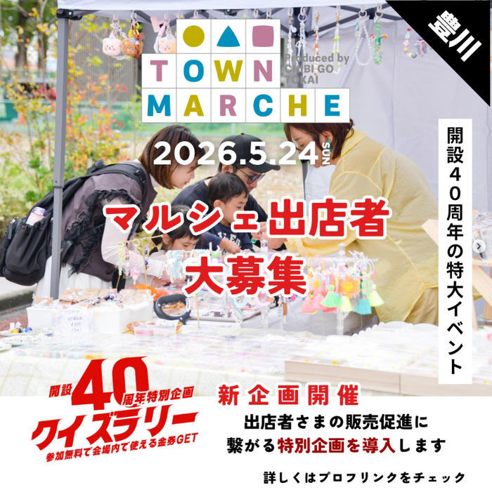 5月24日(日)、愛知県豊川市の中日ハウジングセンターで、40周年を記念した特別イベント「タウンマルシェ」が開催されます。グルメやスイーツ、ワークショップ、ハンドメイドなどの物販、縁日など約50のブースが並ぶほか、ステージパフォーマンスや先着100名限定のクイズラリーなど、家族みんなで楽しめるコンテンツが盛りだくさんです。