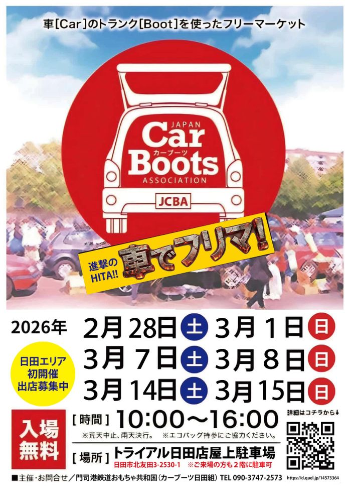 トライアル日田店 2F 駐車場全面で行われる車乗り入型フリーマーケット Car Boots「カーブーツ」が開催されます。10:00~16:00開催。