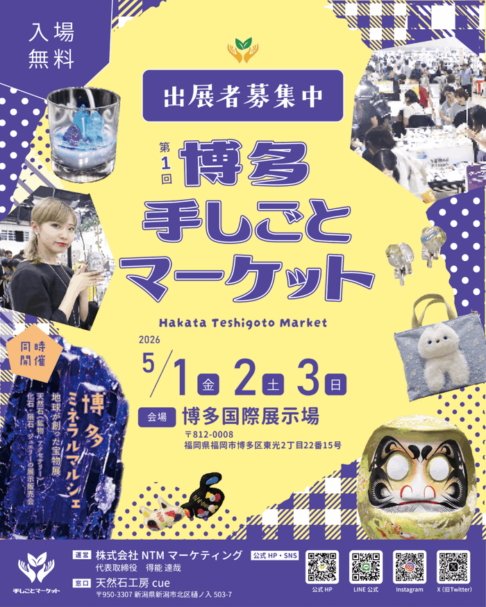 手しごとマーケットとは、ハンドメイドアクセサリー・天然石・クラフト・ワークショップ・インテリア雑貨・リラクゼーション・ヒーリング・飲食・お店やサービスのPRなど、 出展者の作品やサービスを多くの方々に知ってもらい、活動の場を広げる一環を応援する地域密着型マーケットイベントです。5月1日(金)~3日(日)は、博多国際展示場にて開催されます。