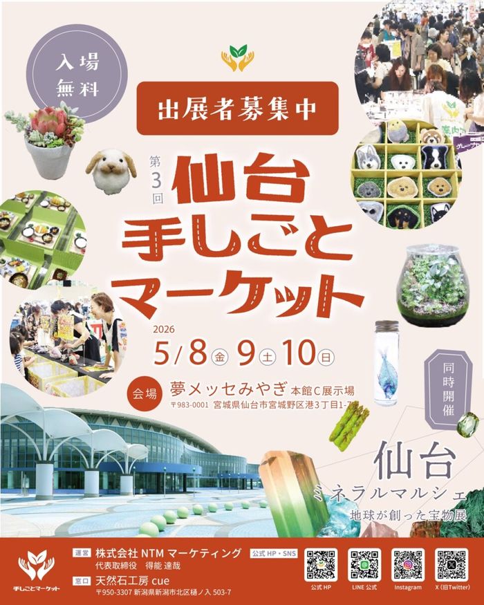 手しごとマーケットとは、ハンドメイドアクセサリー・天然石・クラフト・ワークショップ・インテリア雑貨・リラクゼーション・ヒーリング・飲食・お店やサービスのPRなど、 出展者の作品やサービスを多くの方々に知ってもらい、活動の場を広げる一環を応援する地域密着型マーケットイベントです。5月8日(金)~10日(日)は、夢メッセみやぎにて開催されます。