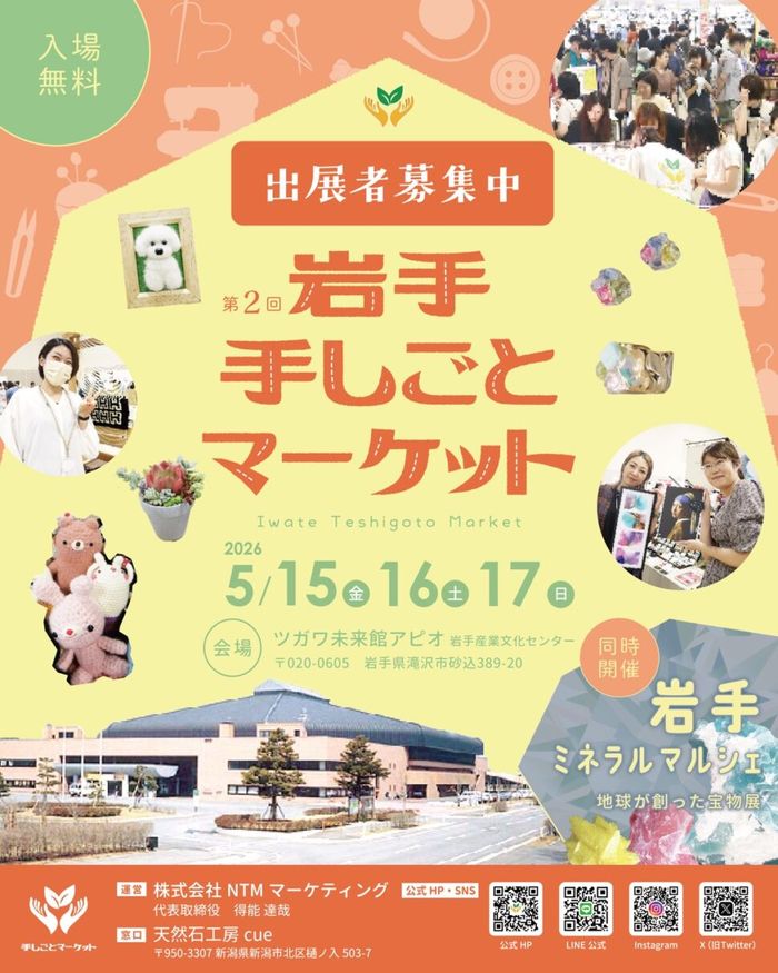 手しごとマーケットとは、ハンドメイドアクセサリー・天然石・クラフト・ワークショップ・インテリア雑貨・リラクゼーション・ヒーリング・飲食・お店やサービスのPRなど、 出展者の作品やサービスを多くの方々に知ってもらい、活動の場を広げる一環を応援する地域密着型マーケットイベントです。5月15日(金)~17日(日)は、ツガワ未来館アピオ 岩手産業文化センターにて開催されます。