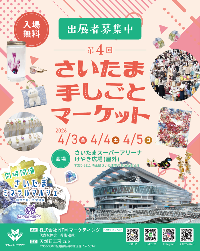 手しごとマーケットとは、ハンドメイドアクセサリー・天然石・クラフト・ワークショップ・インテリア雑貨・リラクゼーション・ヒーリング・飲食・お店やサービスのPRなど、 出展者の作品やサービスを多くの方々に知ってもらい、活動の場を広げる一環を応援する地域密着型マーケットイベントです。4月3日(金)~5日(日)は、さいたまスーパーアリーナにて開催されます。