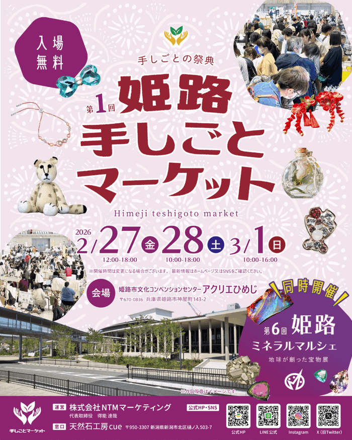 手しごとマーケットとは、ハンドメイドアクセサリー・天然石・クラフト・ワークショップ・インテリア雑貨・リラクゼーション・ヒーリング・飲食・お店やサービスのPRなど、 出展者の作品やサービスを多くの方々に知ってもらい、活動の場を広げる一環を応援する地域密着型マーケットイベントです。2月27日(金)~3月1日(日)は、アクリエひめじにて開催されます。