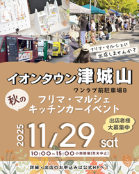 【イオンタウン津城山】フリマ・マルシェイベント 20店 【 お車でお越しの場合 】 アクセスは「中勢バイパス」からが便利! 「中勢バイパス」久居野村交差点より車で2分でございます。 <四日市市・津市方面> 国道23号線「垂水」交差点を右折し、県道114号線を南へ直進2.2km バイパス「垂水」の交差点を国道に入らず直進 <松阪市方面> 国道23号線「雲出本郷町」交差点を左折、国道165号線をJR紀勢本線を超えて、 2つ目の信号(「三重県警察学校」さん)を右折し、県道114号線を北へ1.4km(5つ目の信号) <久居方面> 国道165号線を東へ「三重県警察学校」さん手前の交差点を左折し、県道114号線を北へ1.4km(5つ目の信号) 【 バスでお越しの場合(1時間に約2本運行) 】 JR・近鉄津駅東口より「津駅前」バス乗り場1番にて「警察学校」行きに乗車し約25分 最寄りの停留所は「城山北」 ※「城山北」に停留しない場合は「中城山」または「城山西」にて下車 ※運行スケジュール等は、「三重交通」HPにてご確認くださいませ。