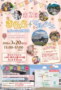 きららマルシェin神戸・舞子公園2026春 100店 JR舞子駅・山陽電鉄舞子公園駅下車、南へ約5分 ※舞子駅の遊歩道から直通です。 第二神明道路利用は高丸インターチェンジを出て南西へ約4km