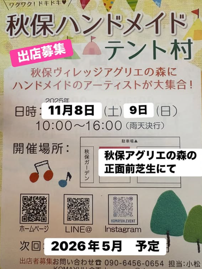 仙台市の食と農のテーマパーク「秋保ヴィレッジ アグリエの森」で、年に数回開催されるハンドメイドイベントです。多彩な作家が集まり、個性豊かな作品の展示・販売やワークショップが行われます。秋の自然を感じながら、手づくりの品や体験を楽しめます。買い物や散策がてら、立ち寄ってみてはいかがでしょうか。