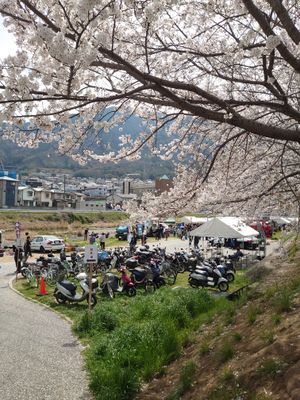 お車でお越しの方は河川敷を下りて駐車してください